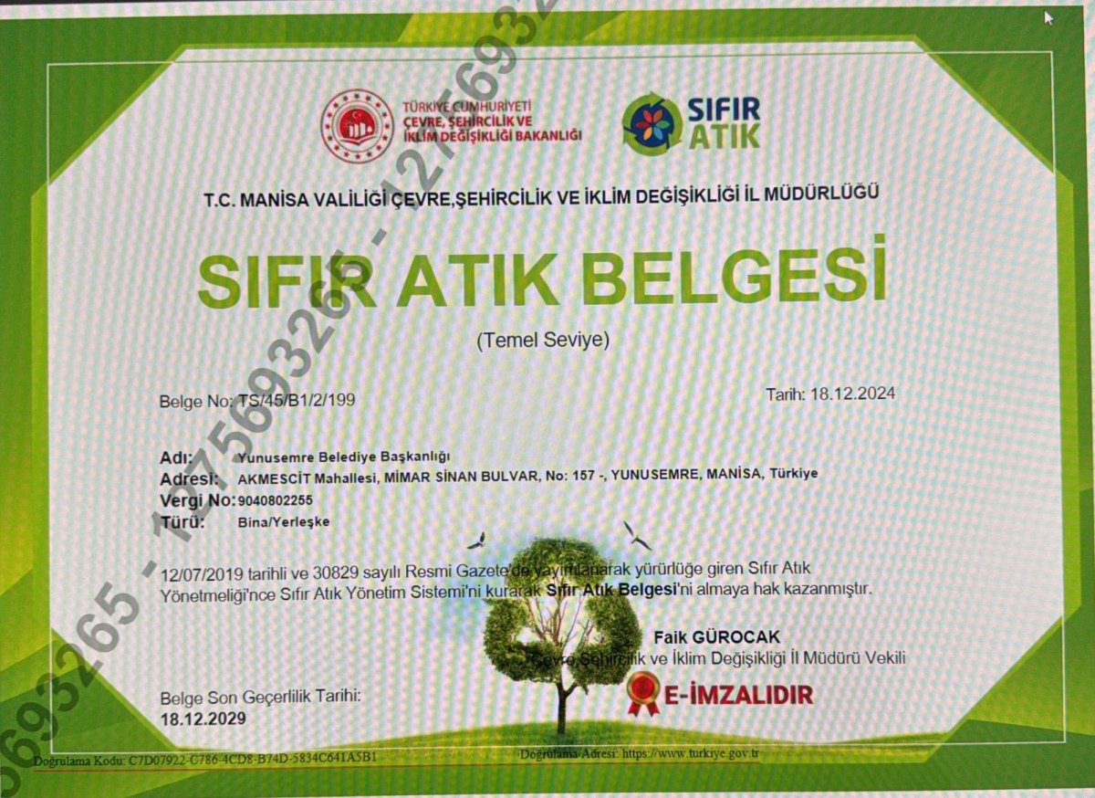 Yunusemre Belediyesi, çevre dostu yaklaşımı ve sürdürülebilirlik konusundaki hassasiyetiyle önemli bir başarıya imza attı. Çevre ve Şehircilik Bakanlığı’nın sıfır atık mevzuatında belirlenen tüm kriterleri yerine getiren Yunusemre Belediyesi, ana hizmet binası için Sıfır Atık Belgesi almaya hak kazandı.